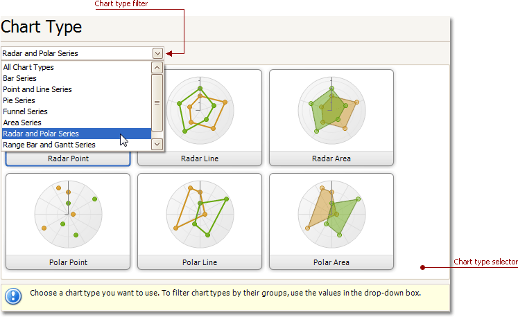 - Radar and Polar Series (Radar Point, Radar Line, Radar Area, Polar Point, Polar Line and Polar Area).