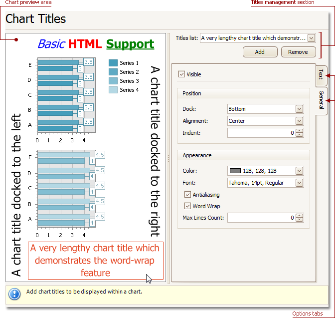 Specifies a title's visibility, alignment and font options, and determines whether the word-wrapping is enabled for a title.