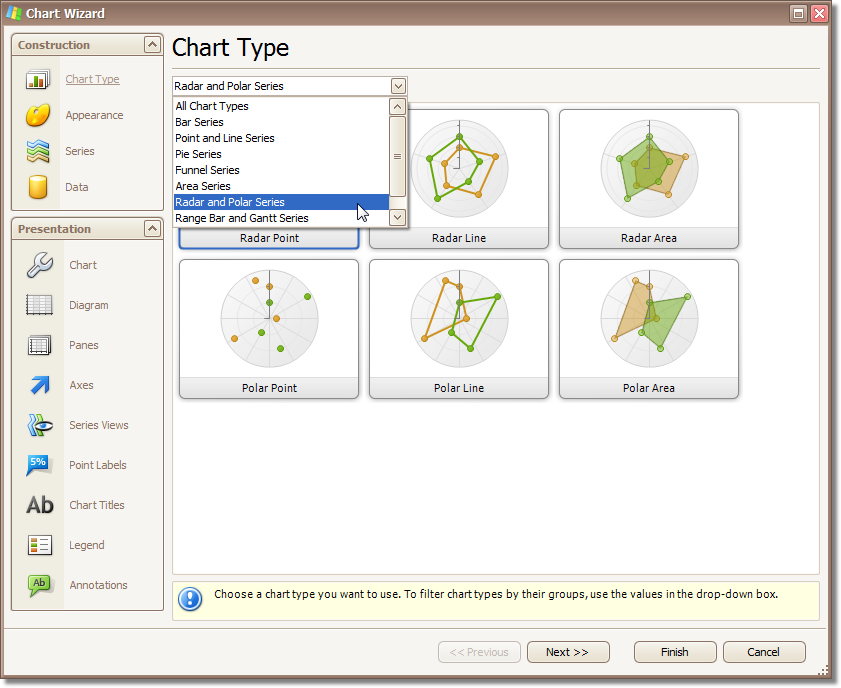 Use the chart wizard dialog to quickly and easily create a new chart, or modify an existing one.