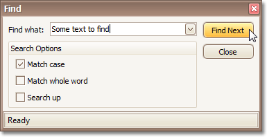 In this dialog, you can input the text to find, and specify whether to match case or the whole word during the search, or set the search direction.
