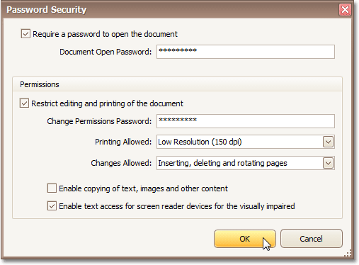 These options allow you to adjust the security options of the resulting PDF file (e.g. enable open document, editing, printing and copying protection, and specify which changes are allowed).
