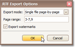 Define the pages which will be included in the result. Separate page numbers with commas, set page ranges using hyphens. - Also, using the appropriate check box, you can choose whether the exported document should include watermarks (if they exist).