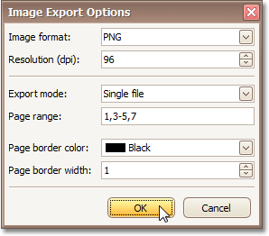 - The Single file page-by-page mode allows export of a document to a single file, divided into pages. In this mode, the Page range, Page border color and Page border width options are available.
