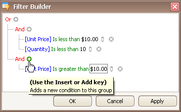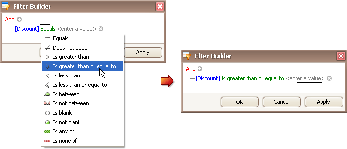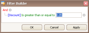 Basically, filter conditions specify what data to select from a data source and display in a data-bound control. A typical simple filter condition consists of three parts: the column/field name, operator and a value(s). For instance, '[Discount] >= 0.05' is a simple filter condition, where '[Discount]' is a field name, '>=' is an operator and '0.05' is a value. This condition when applied to a data-aware control will display records that have values in the Discount column greater than or equal to 0.05. Here is how to create this condition via the Filter Editor (it's assumed that the underlying data source contains the Discount column, otherwise, this column will not be accessible in the Filter Editor's column list):
