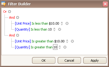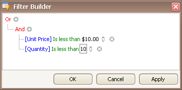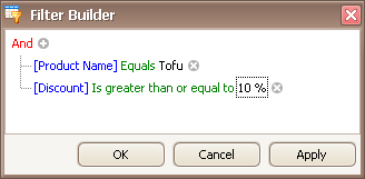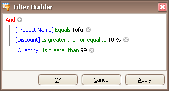 Filter criteria typically consist of two or more simple filter conditions combined by logical operators (AND, OR, NOT AND, NOT OR). The following example shows how to construct filter criteria in the Filter Editor that consist of multiple conditions combined by one logical operator. The "[ProductName] = 'Tofu' AND [Discount] >= 0.1 AND [Quantity] > 99" filter expression contains three simple filter conditions combined by the AND operator. To construct it, do the following: