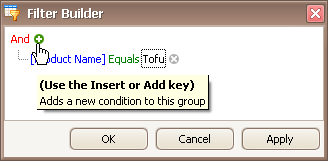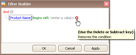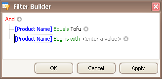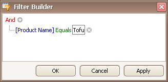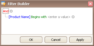 When invoking the Filter Editor for a grid control, if no filtering has yet been applied, the Filter Editor will contain a new filter condition referring to the clicked column. If, for example, the Filter Editor has been opened by right-clicking a Product Name column, it will look like the image below: