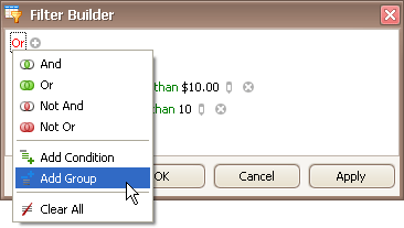 For the condition within the created group, set the column to 'UnitPrice', operator to '>' and operand value to '10':