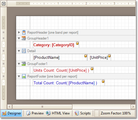 The Designer Tab allows you to customize a report, manage its bands and controls and define their properties.