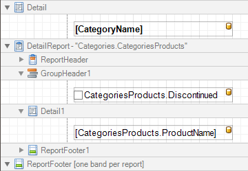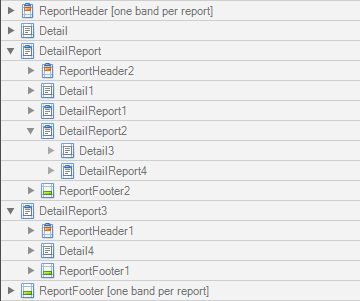 The Detail Report band is a type of band used to incorporate one report into another in master-detail reports. It is quite different from the Detail band, since it holds the whole detail report in a master-detail report layout, and therefore can contain other types of bands within it.