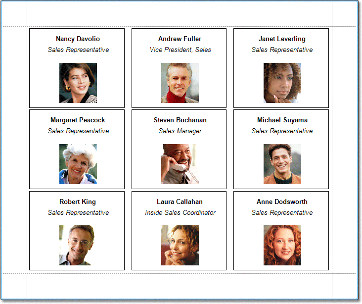 This tutorial describes the steps to create a label report containing employee badges, using the Report Wizard.