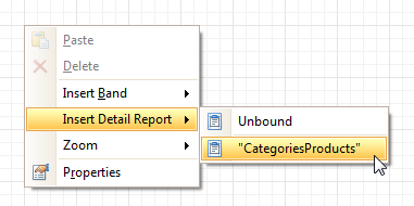 Now, to add a Detail Report band, right-click anywhere on the report's surface, and in the invoked Context Menu, point to Insert Detail Report. When the report's data source contains a data relationship, it is displayed in the Context Menu.