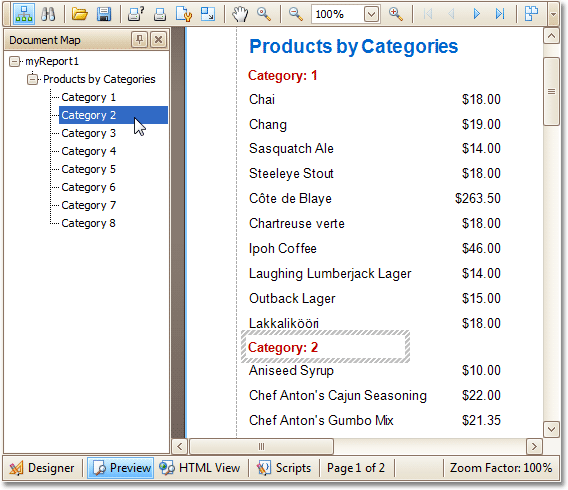 This tutorial describes the steps to create a report with bookmarks (a so-called Document Map). This feature allows you to easily navigate through the report during print preview.