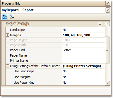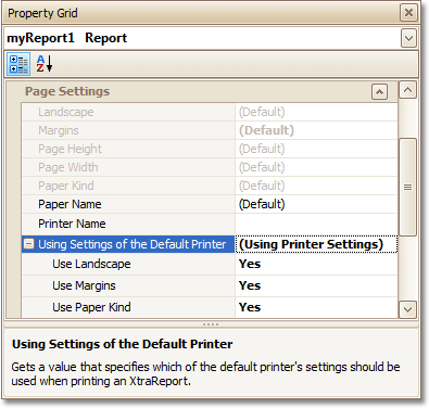 For the orientation, margins and paper size, you can specify a requirement that applies the corresponding printer settings instead of the report's. In this instance, the page properties in the Property Grid are disabled and displayed as grayed out. This may be useful when the report is printed in several places with different printers and printer settings.