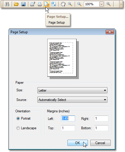 The report's Preview Tab toolbar has a corresponding button that enables you to modify the page settings. Clicking this button invokes the Page Setup dialog, which allows you to adjust the page layout before printing or exporting, and select the printer.