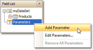 To add a parameter to the report, in the Field List, right-click the Parameters section, and in the invoked menu, choose Add Parameter.