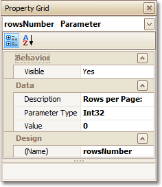 Select the parameter, and in the Property Grid, set its Description to Rows per Page:, Parameter Type to Int32 and (Name) to rowsNumber.