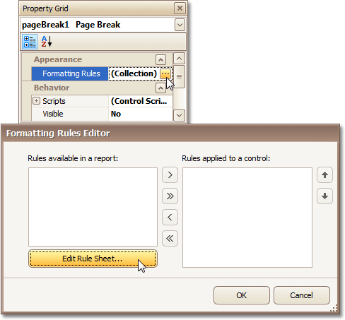 Select the Page Break, and set its Visible property to No. Then, click the ellipsis button for its Formatting Rules property, and in the invoked Formatting Rules Editor, click the Edit Rule Sheet... button.