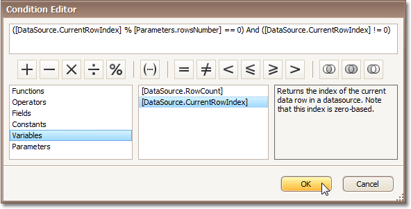 In the invoked Condition Editor, define a logical expression for the rule, (e.g. ([DataSource.CurrentRowIndex] % [Parameters.rowsNumber] == 0) And ([DataSource.CurrentRowIndex] != 0)).