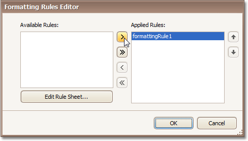 Now, back in the Formatting Rules Editor, move the created rule to the list of applied rules on the right, using the arrow buttons in the middle of the dialog.