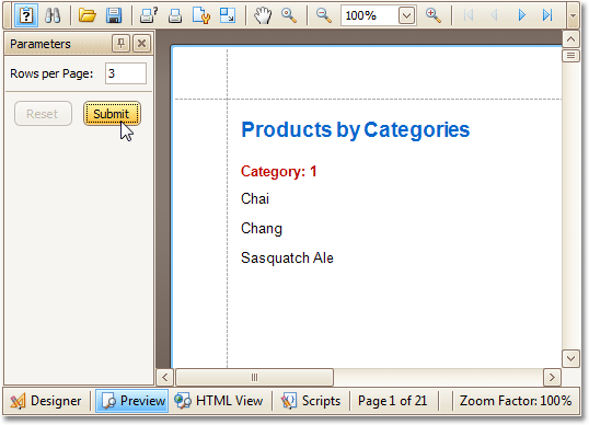 The report is now ready. Switch to the Preview Tab, and in the Parameters section, define the required value and click Submit.