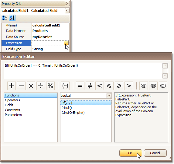 And, in the invoked Expression Editor, define the required logical condition for the calculated field (e.g. Iif([UnitsOnOrder] == 0, 'None', [UnitsOnOrder]), which means that if the UnitsOnOrder data field's value is equal to 0, the control's text will be replaced with None).