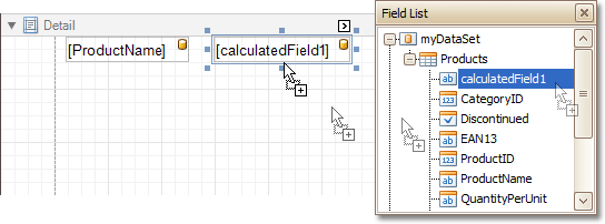Finally, drop the required data fields (and the created calculated field as well) from the Field List onto the report's Detail band.