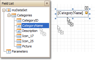 To bind an existing report control to a data field, click the required field item in the Field List, and then drag and drop it onto the control. The yellow database icon inside it will indicate that it's been successfully bound.
