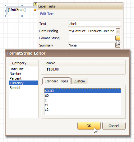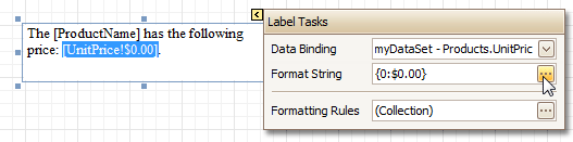 To apply value formatting for a data-bound control's content (e.g. for it to be treated as currency, or date-time content), locate this control, click its Smart Tag, and in the invoked actions list, click the ellipsis button for the Format String entry.