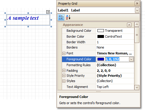 Use the Property Grid, where all appearance-related properties are located under the Appearance category.