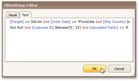 In the Filter String Editor, you can either use the Visual expression builder, or specify the expression in Text.