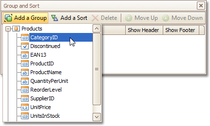 Now, switch to the Group and Sort Panel, and click Add a Group. In the invoked list, choose a data member across which the report is to be grouped. Note that grouping across calculated fields is supported, as well.