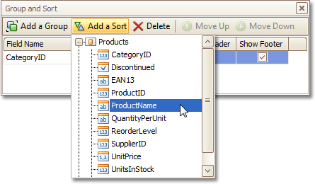 Switch to the Group and Sort Panel, and click Add a Sort. In the invoked list, choose a data member across which the report is to be sorted.