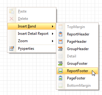 To display the result at the bottom of a report, the Report Footer band should be present. To add it, right-click anywhere over the report's area and in the invoked Context Menu, select Insert Band | ReportFooter.