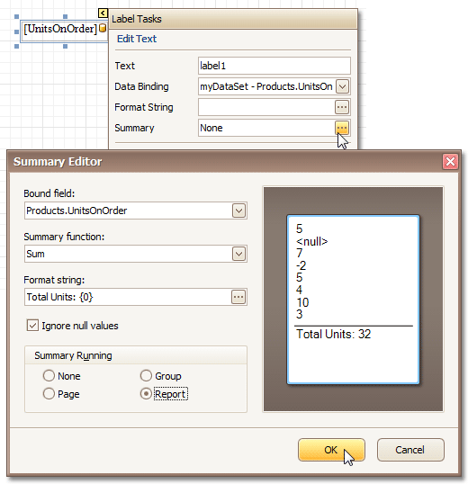 With Report Designer, you can force a data-bound control to calculate one of the standard summary functions (Average, Summary, Count, Running Summary, Percentage, Max or Min).