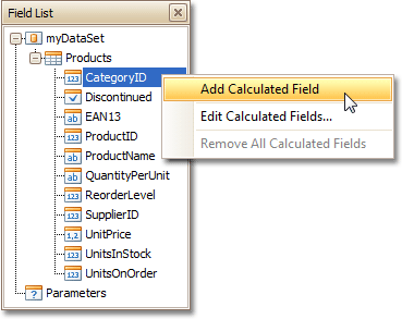 To create a calculated field, in the Field List, right-click any data member, and on the invoked menu, choose Add Calculated Field.