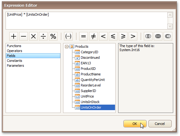 Click Fields to see the field list. Double-click field names to add them to the expression string. Use the toolbar to add operators between field names.