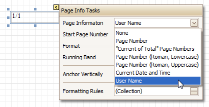 Select the Page Info control, click its Smart Tag, and in the invoked actions list, expand the drop-down list for the Page Information entry.