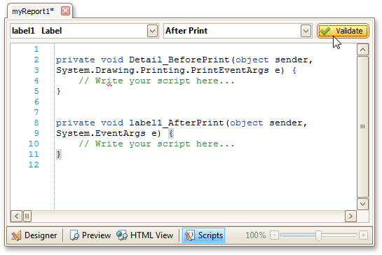 The Scripts Tab allows you to manage your report's scripts. It provides centralized access to all the scripts being written for a report or any of its elements (bands and controls).