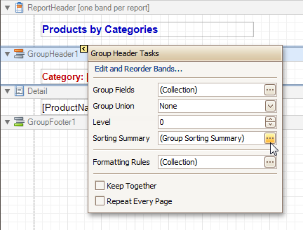 Select the Group Header band and click its Smart Tag. In the invoked actions list, click the ellipsis button for the Sorting Summary option.